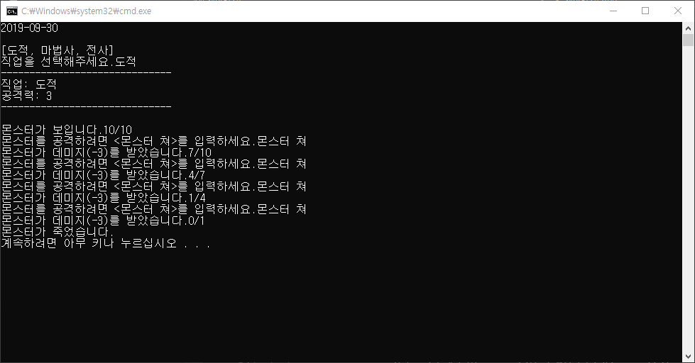 9일차 메서드의 정의(15) 캐릭터 선택, 몬스터 공격
