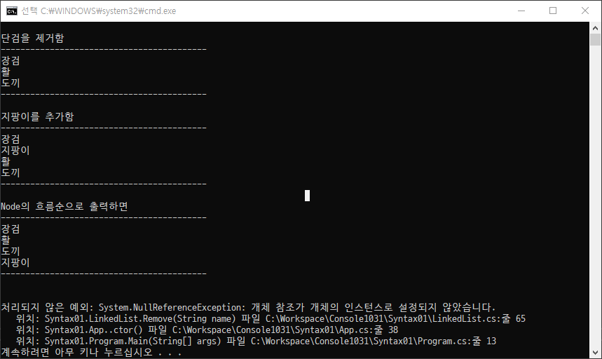 마지막에 제일 처음의 장검을 제거했더니 오류가 발생했다.