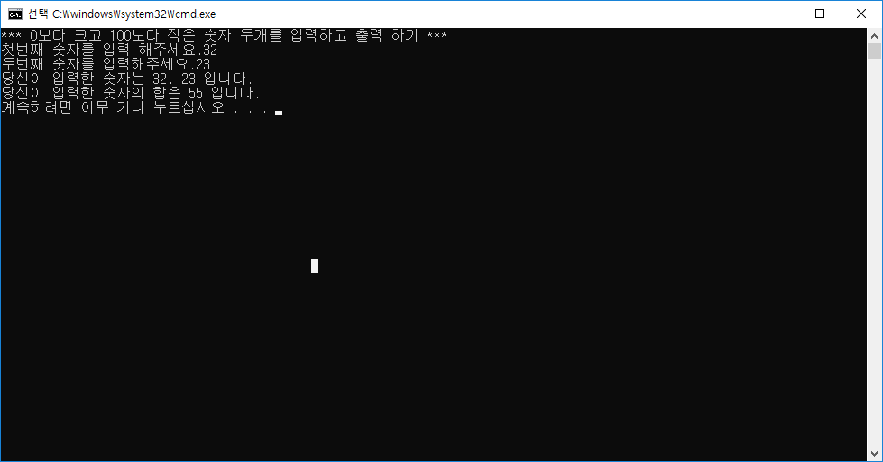 Console.WriteLine("*** 0보다 크고 100보다 작은 숫자 두개를 입력하고 출력 하기 ***");