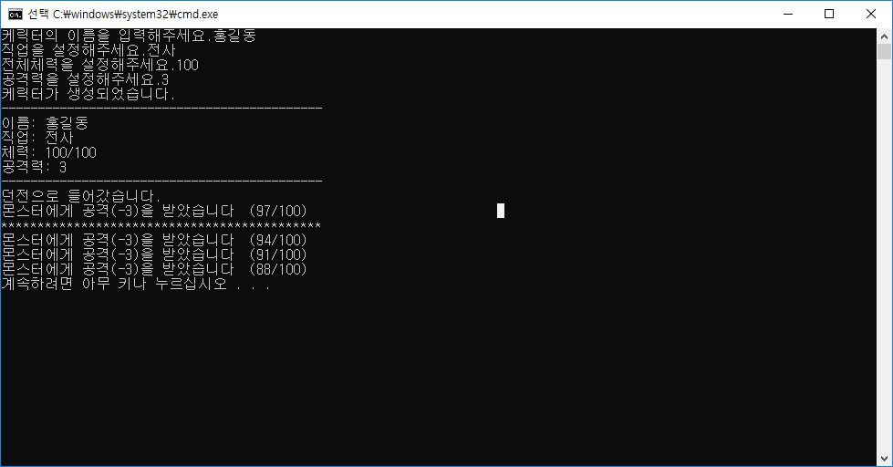 3일차 케릭터의 이름을 입력해주세요. (2) 몬스터가 4번 공격함