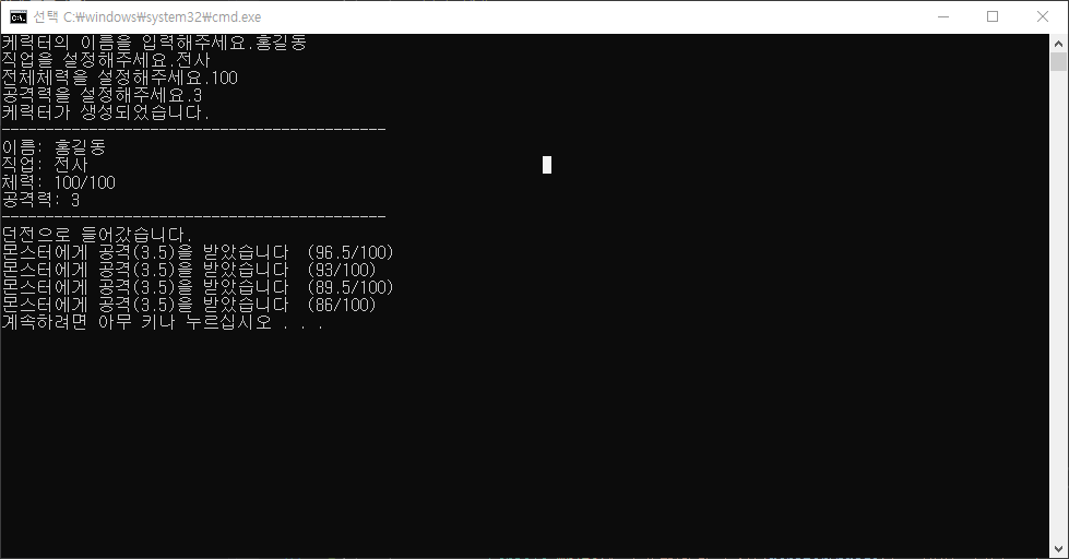 | 3일차 케릭터의 이름을 입력해주세요. (4) (몬스터에게 공격을 받았습니다. )의 색깔바꾸기 (0) | 2019.09.20 |