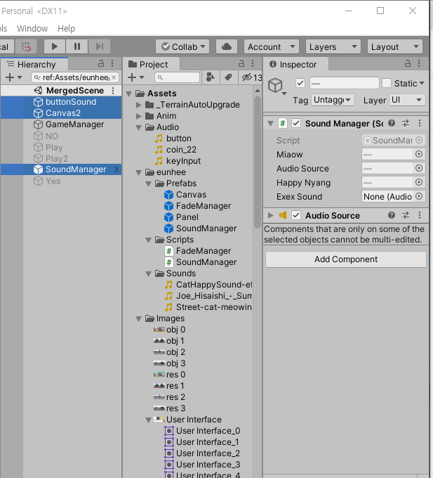 2021-05-18T12:32:22.560Z:error4470/4450 Unity NullReferenceException: Object reference not set to an instance of an object<br> at SoundManager.happayNyangSound () [0x00008] in <a50795ddedf54d4a9320c22372e751e0>:0 <br> at CatCtrl.Instance_TouchCompleteOperate () [0x0000a] in <a50795ddedf54d4a9320c22372e751e0>:0 <br> at (wrapper delegate-invoke) <Module>.invoke_void()<br> at DelegateManager.TouchCompleteOperation () [0x0000a] in <a50795ddedf54d4a9320c22372e751e0>:0 <br> at testTrigger.OnTriggerEnter (UnityEngine.Collider other) [0x00055] in <a50795ddedf54d4a9320c22372e751e0>:0 <br> <br>(Filename: <a50795ddedf54d4a9320c22372e751e0> Line: 0)<br><br>