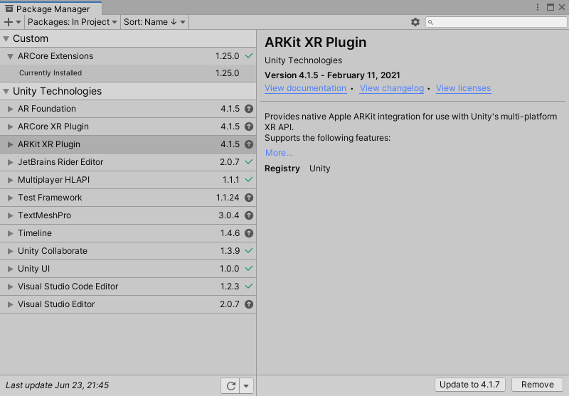 AR Core Extensions From git URL ( + button in Package Manager)