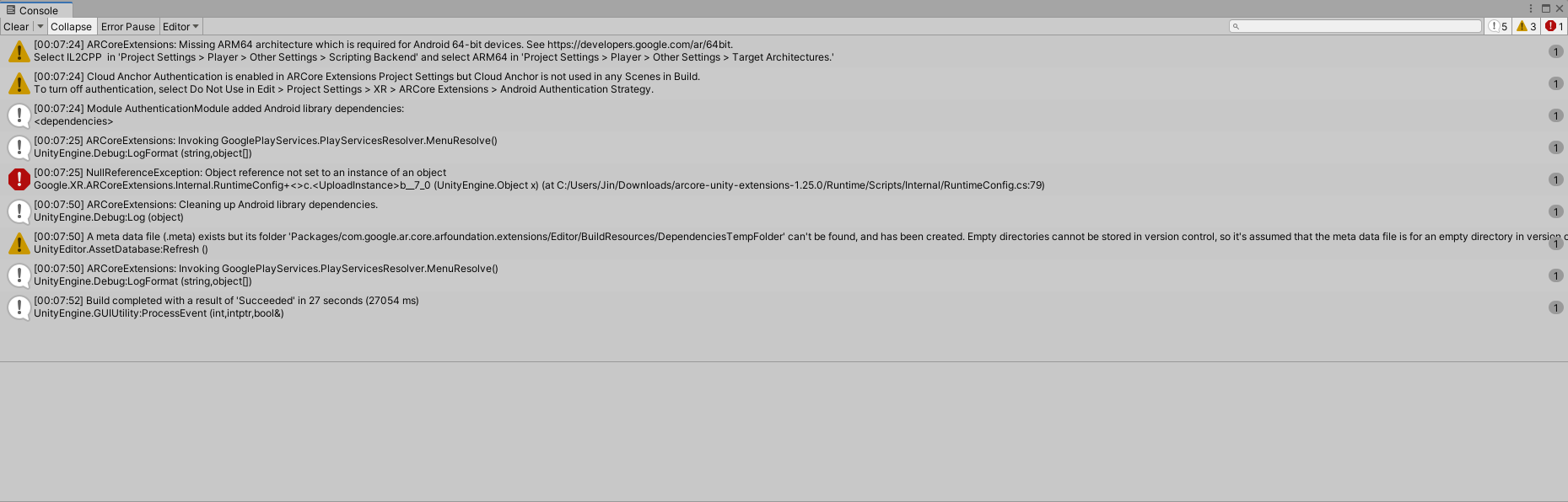 If meta file error occured, download arcore-unity-extension.zip.