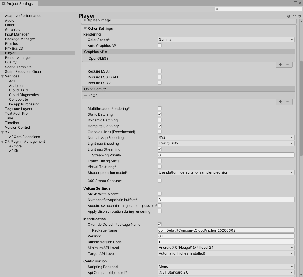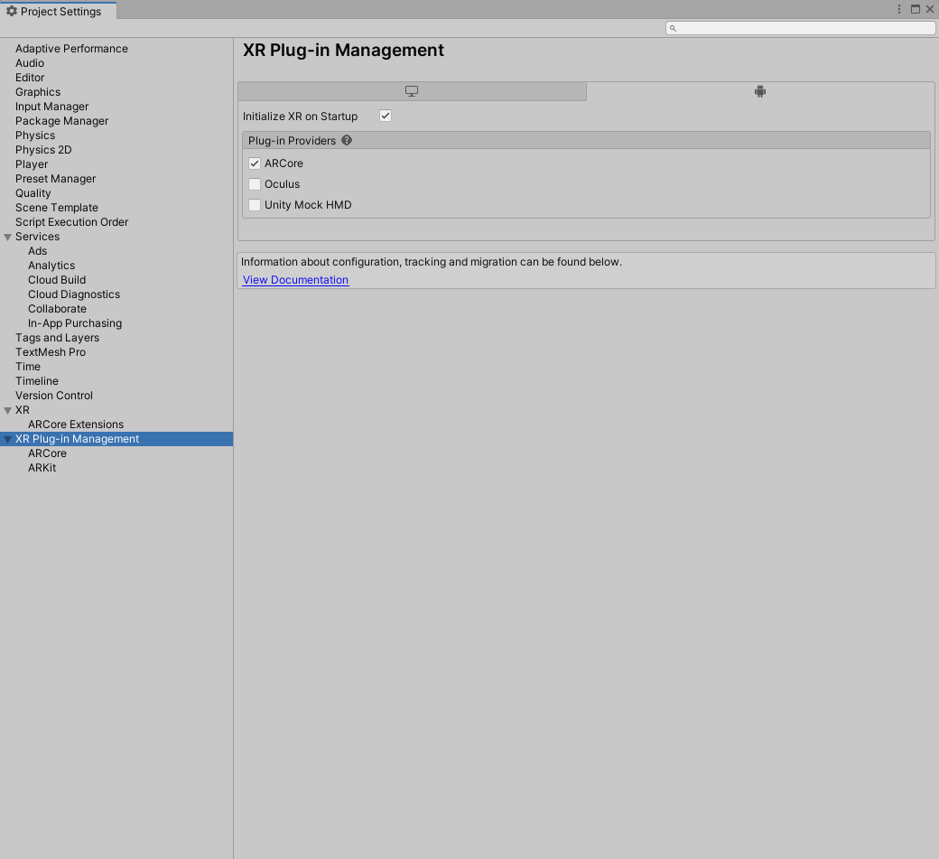 XR Plug-in Management-------------->Android Icon, Plug-in Providers, AR Core Check